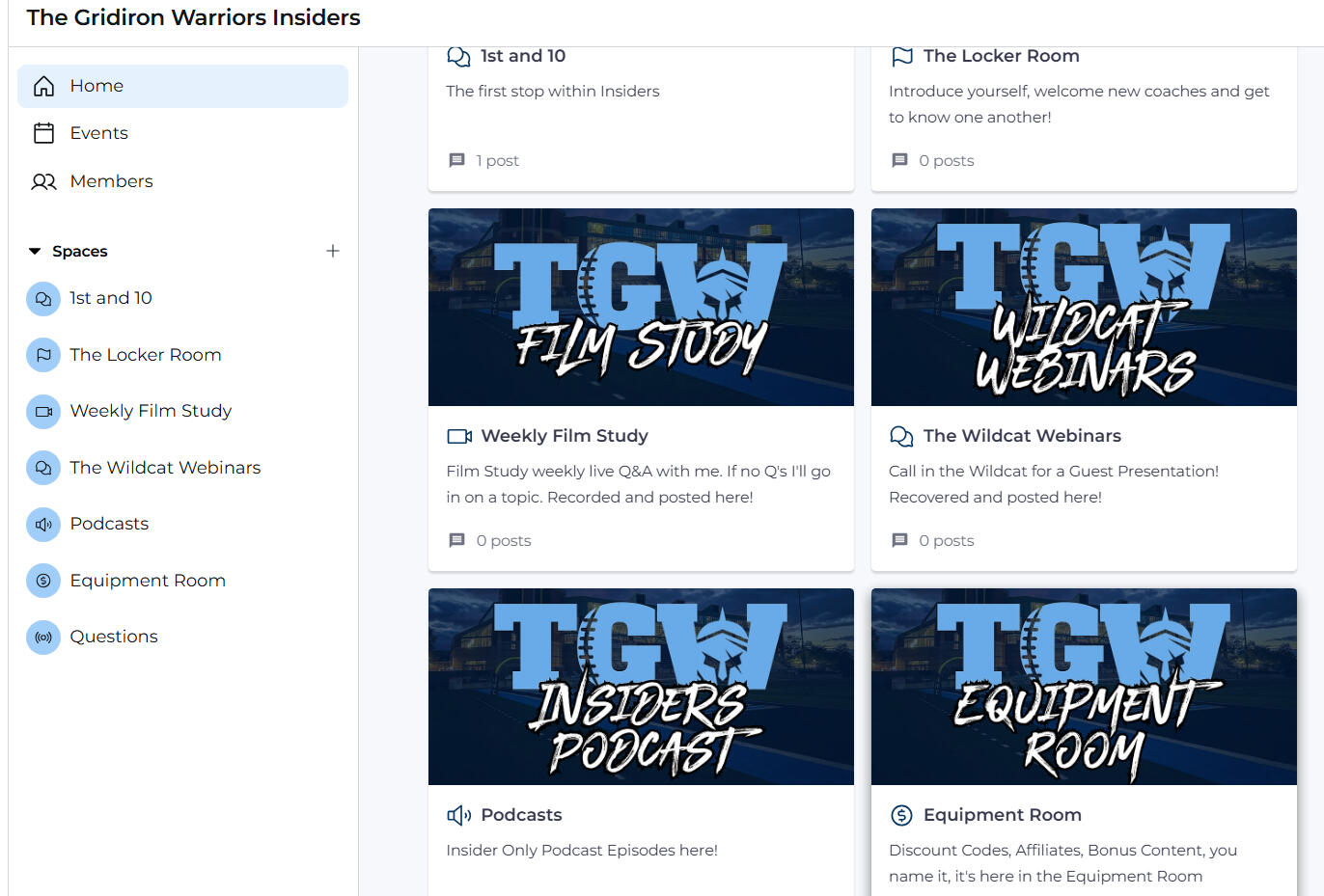 Weekly Film Studies: 10–15 minute tactical breakdowns with Q&A to follow.Monthly Wildcat Webinars: Guest Coach Webinars with live Q&A.The Locker Room: Private community where coaches trade ideas, drills, and film for real-time feedback.Early Access: Watch and Listen to Podcast episodes and courses before anyone else.Exclusive Discounts: TrainHeroic Programs, Course Bundles, and Affiliate Discounts.Discounte entry to the Annual Gridiron Warrior Live Clinic is included in your membership.